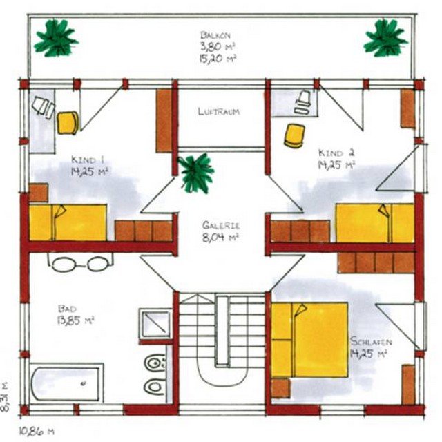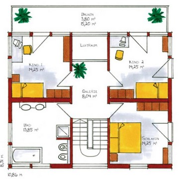 Hier sehen Sie den Grundriss im Obergeschoss unseres Ferienhauses in den Bergen.